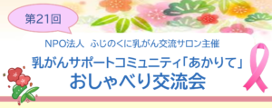 開催のお知らせ!『第9回 乳がん患者さんのおしゃべり交流会』 2025 1/13 2025年1月13日 日時:1月25日(土)11:00 〜 13:00 参加費無料 会場:ウェルピア長泉 2階 多目的室 2 今回は乳がん体験者のためのゆる~いヨガ 申込はこちら 締切 1月24日(金)まで 注意事項等は下記のファイルをご覧ください. 第9回乳がん患者さんのおしゃべり交流会 ちらしダウンロード 乳がん交流サロン 開催のお知らせ!『「あかりて」おでかけ編』 開催のお知らせ!『第10回 乳がん患者さんのおしゃべり交流会』 この記事を書いた人 Fujinokuni Breast Cancer Networking Salon 関連記事 開催のお知らせ!『第21回 乳がん患者さんのおしゃべり交流会』 2025年12月28日 開催のお知らせ!『第14回 乳がん患者さんのおしゃべり交流会』 2025年5月25日 開催のお知らせ!『第11回 乳がん患者さんのおしゃべり交流会』 2025年3月9日 開催のお知らせ!『第10回 乳がん患者さんのおしゃべり交流会』 2025年2月3日 開催のお知らせ!『第7回 乳がん患者さんのおしゃべり交流会』 2024年11月5日